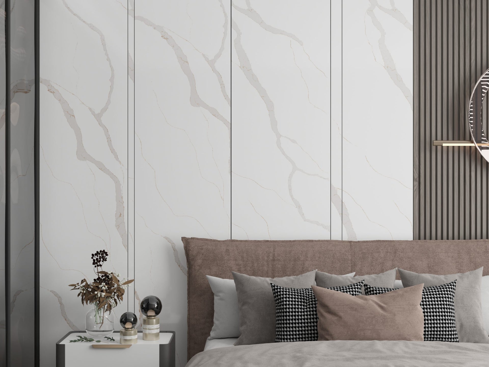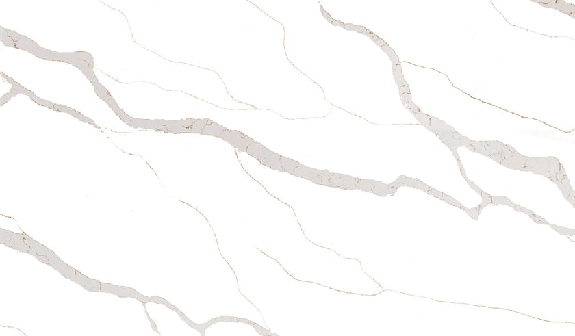 Reliance Surfaces brings this vibrant white quartz background full of luxurious gold veins with a touch of gray giving a huge range of application pos