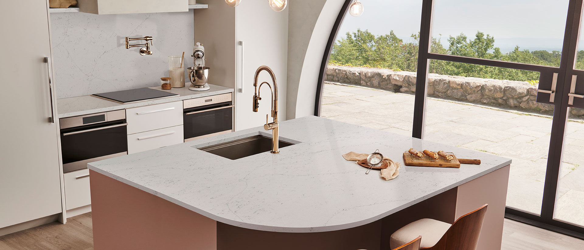 A modern take on a timeless Italian marble, it's perfect for creating easy-care white quartz countertops, waterfall islands, showers, and more, in residential and commercial spaces. Stain-, germ-, and heat-resistant, get luxury looks in a durable 2 cm or 3 cm slab with this understated quartz.