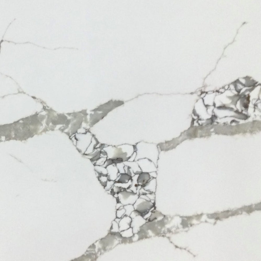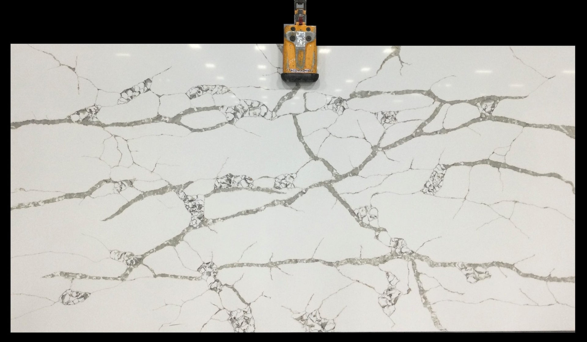 Majestic white background with natural veins framed in gold, gray and white tones making it an unique quartz