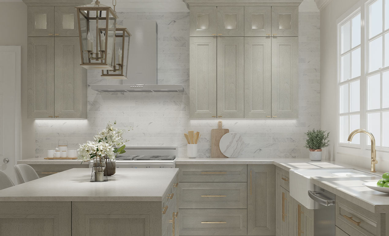 Back: Full ½” plywood back, installed with our interlock system. Screwed to top and bottom. Side Panels: ½” plywood sides. Light maple veneer interior and matching finished exterior. Frame: ¾” thick, 1½” wide, kiln-dried solid hardwood. Frame and sides are installed with our interlocking system, which ensures easy assembly and inseparable strength. Hinges: Heavy duty steel concealed hinge, adjustable with soft-close mechanism. Shelves: ¾ thick, plywood; fully adjustable. Toe Kick: 4½“ toe kick with 3″ inset on all standard base and vanity cabinets.