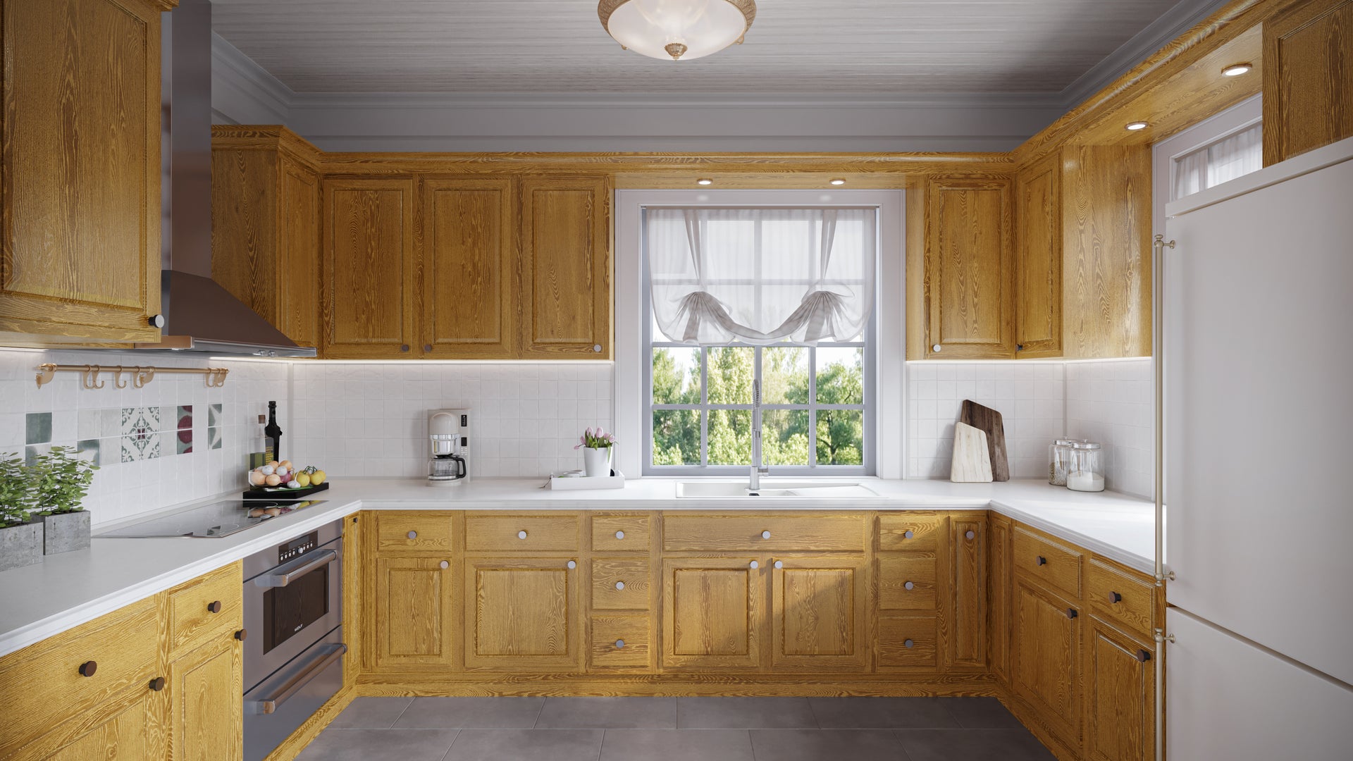 Back: ¼” substrate, with 3” plywood surrounding frame, all plywood material. Rabbeted and stapled into cabinet sides, screwed into top and bottom. End Panels: ½” plywood substrate, with light maple wood grain laminate interior. Matching wood veneer exterior. Frame: ¾” thick, 1½” wide, kiln-dried solid hardwood. Assembled with glue and nails, under clamp pressure, which ensures squareness. Hinges: Heavy duty steel concealed hinge, six-way adjustable. Shelves: ¾ thick, plywood; fully adjustable. Toe Kick: 4½” toe kick with 3 ” inset on all standard base and vanity cabinets.